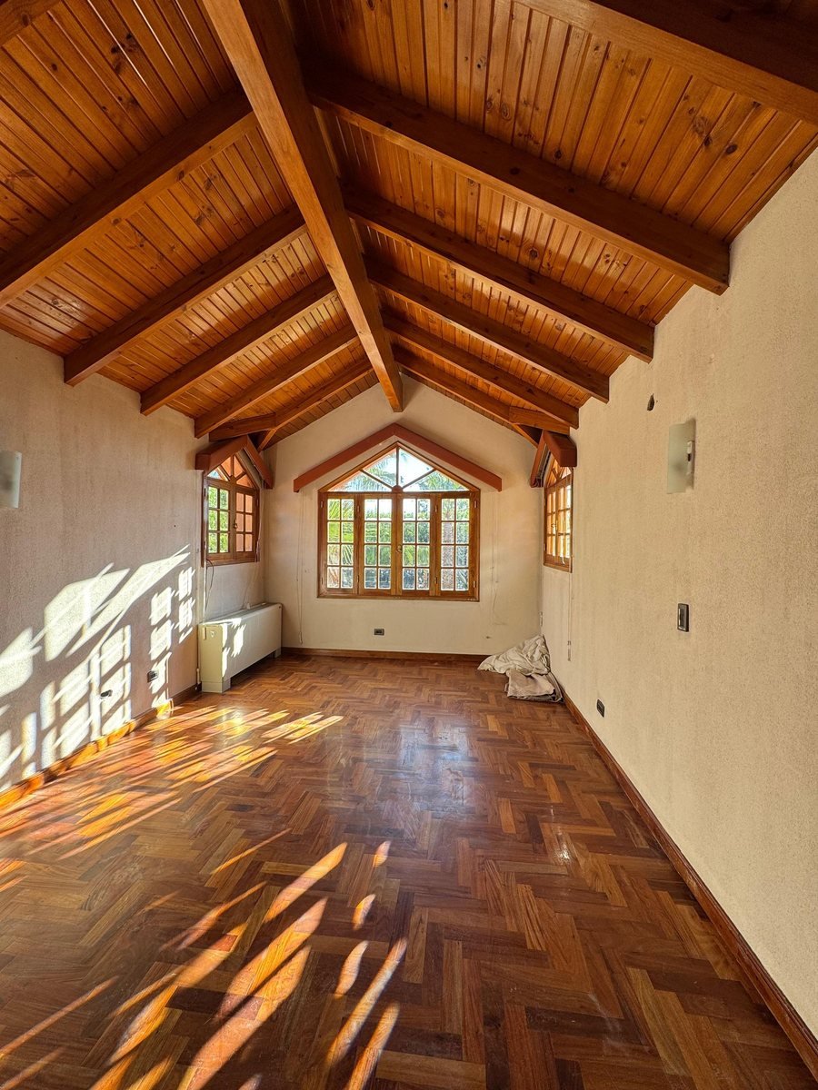 El jardín de gran tamaño alberga una piscina y un quincho de 40 m² adaptado a departamento si se desea (el quincho también cuenta con techo y detalles en viraro)